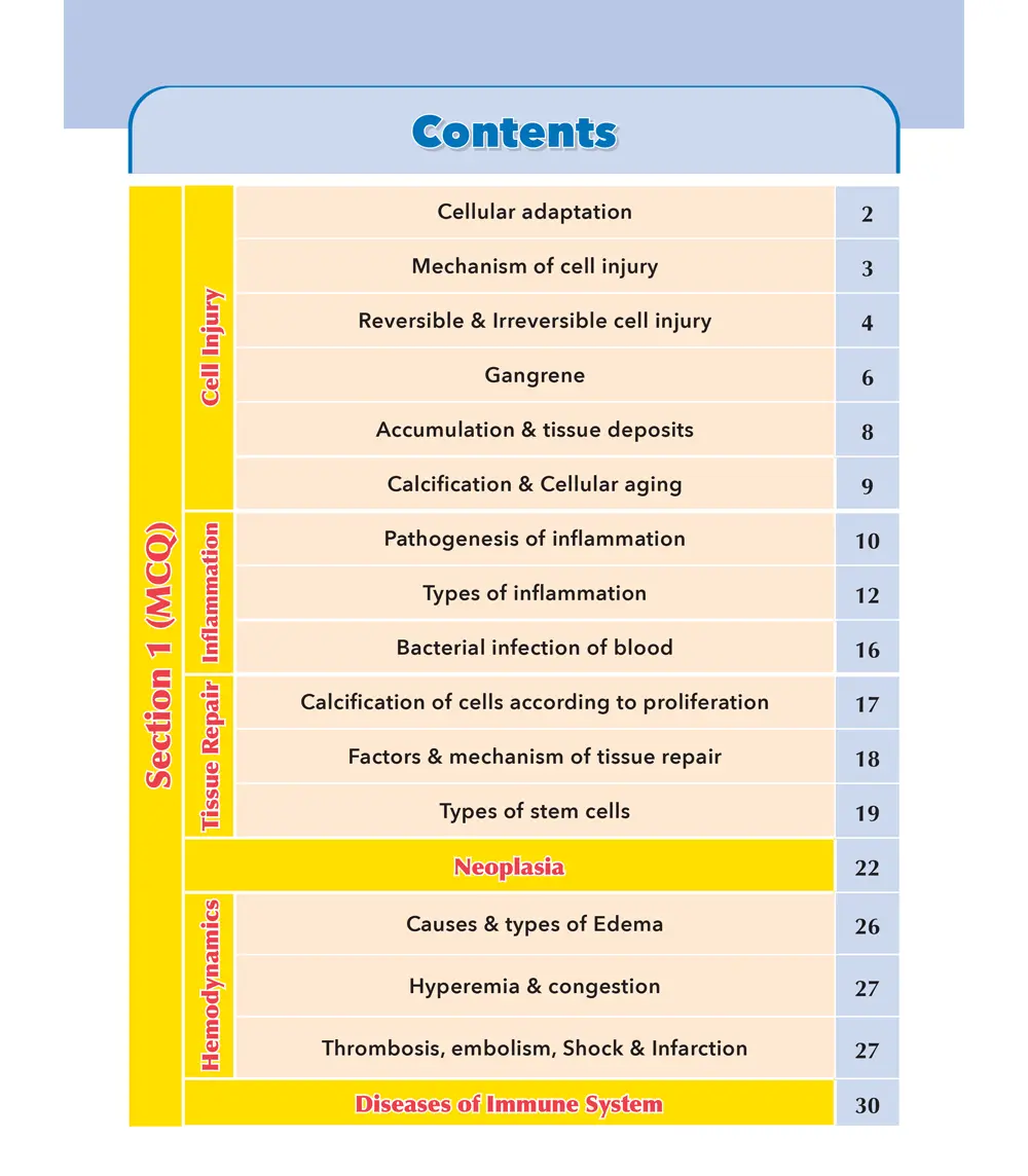 The book includes an extensive collection of Multiple Choice Questions (MCQs) and Short Essay Questions (SEQs) covering the fundamental principles of general pathology. Core topics include cell injury, inflammation, hemodynamic disorders, immune-related pathology, neoplasia, and basic mechanisms of disease.